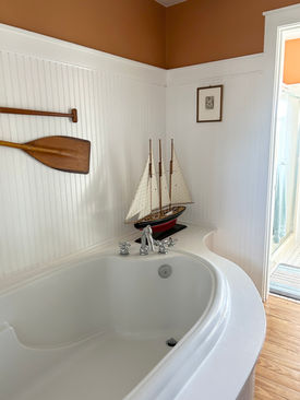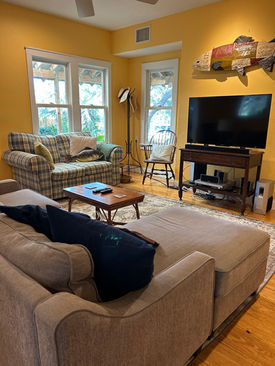 "Beautifully decorated and styled throughout, exceptionally clean with many thoughtful amenities…we especially enjoyed the local ground coffee gift she left on the kitchen table for us! The kitchen is very well-equipped and I easily prepared a nice pot of seafood chowder with fresh local shrimp and scallops. The neighborhood is very quiet and the large porch with the view of the water and sweet yard were perfect for birdwatching the many local birds and pair of ospreys that nested nearby…our small dog was happy too!"